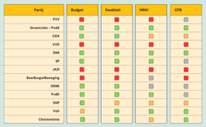 In de onderstaande tabel is gekeken naar drie thema’s per partijprogramma. Allereerst de stabiliteit en omvang van het ontwikkelingsbudget, streeft een partij naar 0,7%? Ten tweede de kwaliteit van het budget, als primair doel zou ontwikkelingssamenwerking duurzame ontwikkeling elders ter wereld moeten hebben. In de derde kolom is er gekeken naar de ruimte voor het maatschappelijk middenveld. Worden zij betrokken in het beleid voor internationale samenwerking, en worden er geen beperkende maatregelen opgelegd?