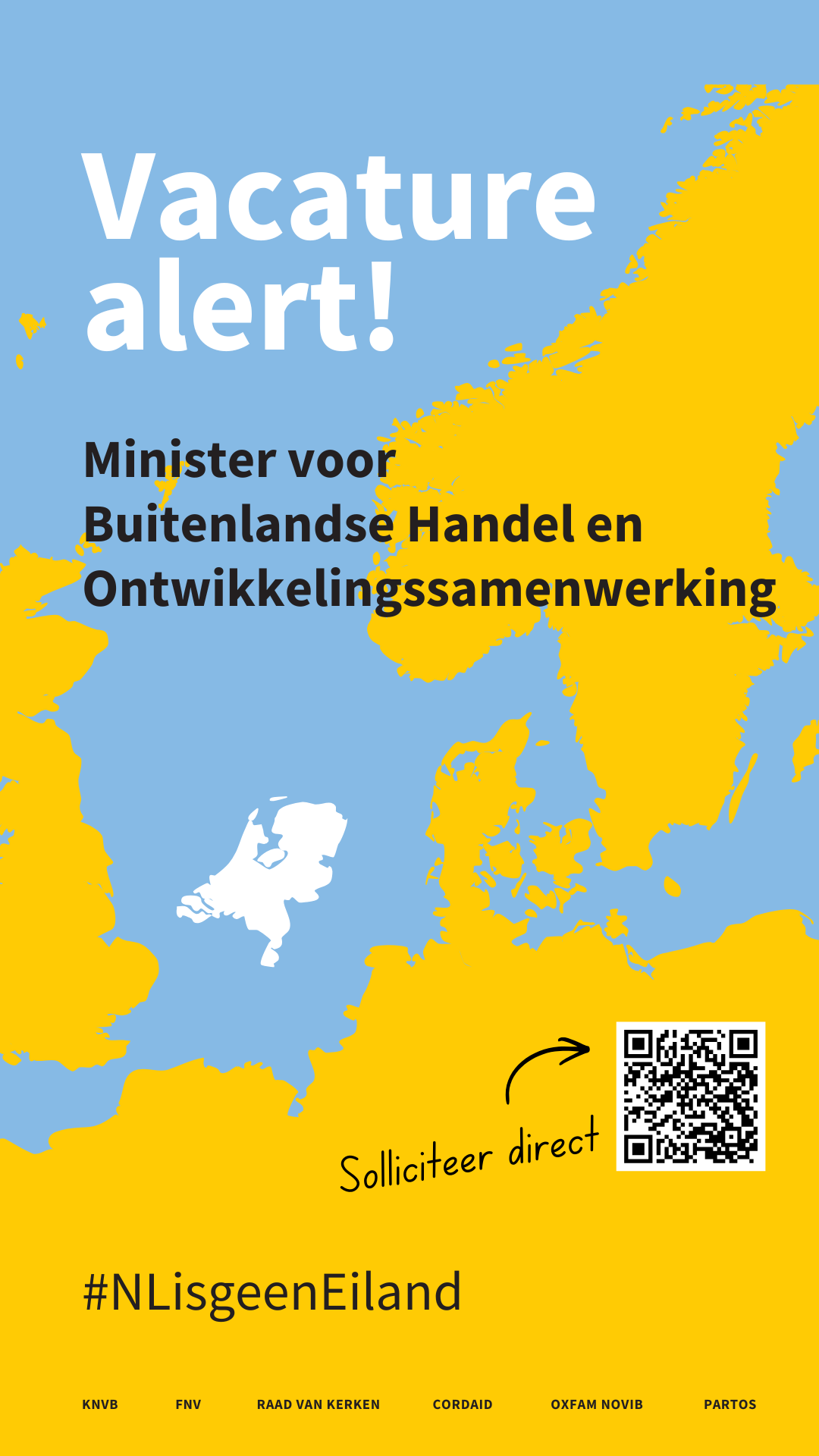 De formatie gaat de laatste fase in. Na jaren van keiharde bezuinigingen lijkt het erop dat in elk geval CDA en D66 opnieuw willen investeren in ontwikkelingssamenwerking. We wachten in spanning af! Niet door op onze handen te zitten. Het praten over posten en poppetjes is nu begonnen, ook dat is bepalend voor solidair en solide beleid. Daarom heeft de NL is geen Eiland-coalitie een vacature geplaatst op LinkedIn. Een ludieke poging om het belang van een sterke minister onder de aandacht te brengen. De vacature zal ook verschijnen op reclameborden bij de Tweede Kamer.