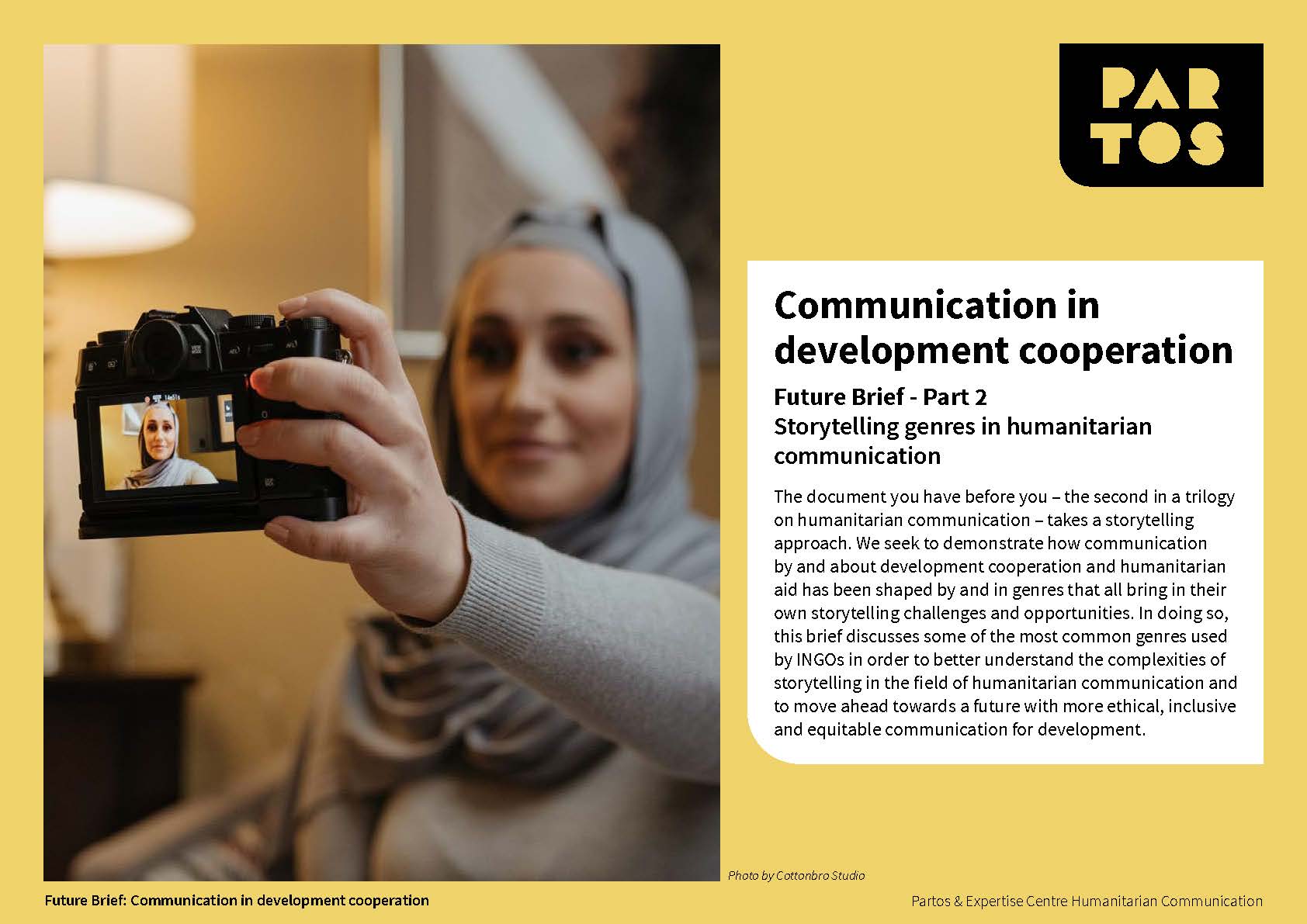 This Future Brief explores how communication by and about development cooperation and humanitarian aid has been shaped by and in genres that all bring in their own storytelling challenges and opportunities. In doing so, this brief discusses some of the most common genres used in the sector in order to better understand the complexities of storytelling and what are, then, the solutions to these storytelling challenges in humanitarian communication? How can we make our campaigns more ethical, inclusive and equitable? The answers to these questions must be sought in a practice of communication in which values such as solidarity, equality and justice are made central. Campaigns that are steeped in the complexity, history and politics, and based on the agency, dignity and humanity of vulnerable people in the global South, are able to contribute to a more just global society. Particularly, two umbrella strategies could be used in the pursuit of ethical, inclusive and equitable communication: postcolonial criticism and participatory storytelling.