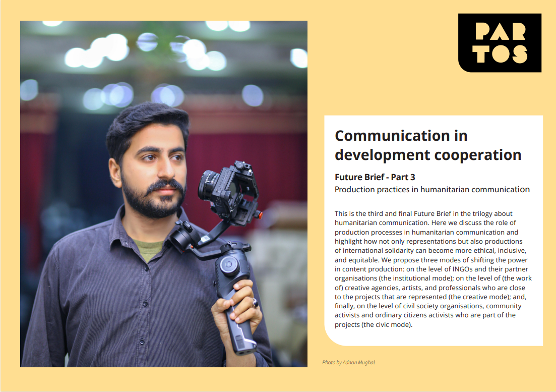 This is the third and final Future Brief in the trilogy about humanitarian communication. Here, we discuss the role of production processes in humanitarian communication and highlight how not only representations, but also productions of international solidarity can become more ethical, inclusive, and equitable. We propose three modes of shifting the power in content production: on the level of INGOs and their partner organisations (the institutional mode); on the level of (the work of) creative agencies, artists, and professionals who are close to the projects that are represented (the creative mode); and, finally, on the level of civil society organisations, community activists and ordinary citizens activists who are part of the projects (the civic mode).